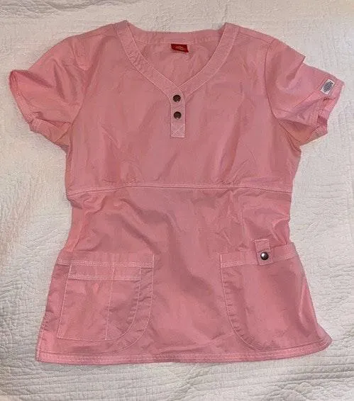 Re-listing. Only needed it for work but not anymore. In perfect condition! Pink Dickies scrub top in excellent condition! It was barely worn the size tag is cut out but it’s a size small but could probably fit a medium. There are 4 pockets on the front along with a button closure for the one as pictured. Cute button accents at the top that you can actually unbutton.