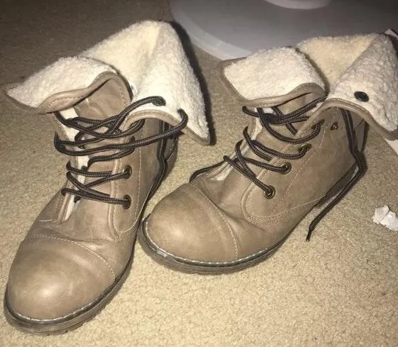 Sooo warm!! Stylish with a distressed look (very chic). True to size but I am an 8 & could still fit in them just a little snug. Still fit fine though! Only worn a handful of times. Can be worn with the flap buttoned down or straight up! Send offers!
