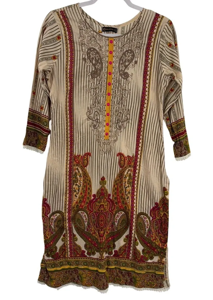 Dish Deena Boho Paisley Tunic Dress Embroidered Indian Folk Cotton 3/4 Long Sleeve, side slits, lace trimmed on hem and sleeves Embroidered paisley and faux buttons, vertical stripe pattern Good Pre-owned condition, please see photos, there is no care tag Size Large No care tag, but feels like cotton Approximate measurements in inches: Pit to pit: 19.5 Shoulder to hem: 39 boho, bohemian, paisley print, embroidered dress, tunic dress, ethnic inspired, Indian inspired, folk style, cottagecore, festival wear, earthy tones, neutral beige, long sleeve tunic, casual dress, artisan look, hippie boho, relaxed fit