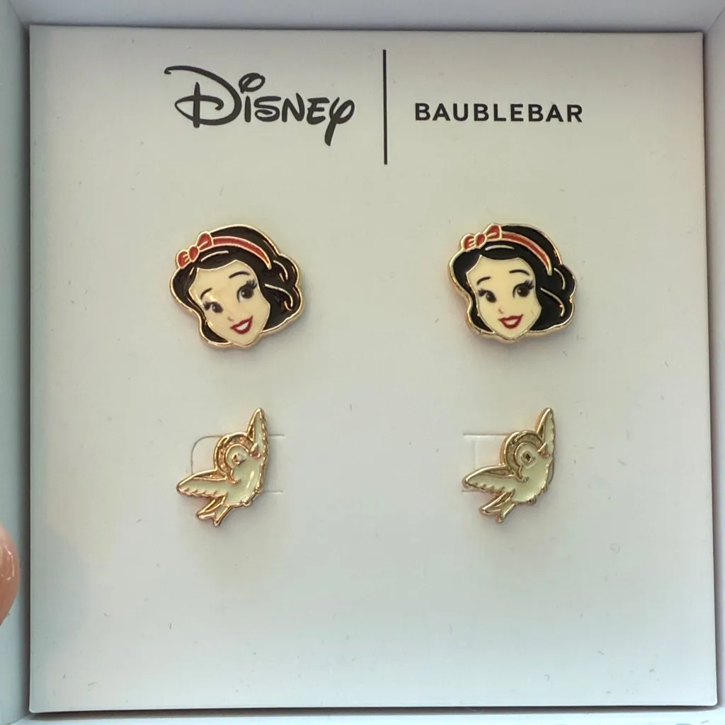 Embrace whimsical charm with these enchanting Disney x BaubleBar Snow White stud earrings. Delight in the iconic likeness of Snow White herself, rendered in vibrant enamel and accented with a sweet red bow, paired with a darling little bird charm, reminiscent of her woodland friends. These playful earrings capture the magic of Disney, adding a touch of fairytale sparkle to your everyday look. Perfect for a casual day out, a Disney-themed event, or as a delightful gift for any Disney enthusiast. Style: Stud, Dangle/Drop Main Stone Color: Multicolor Closure: Butterfly Theme: Fairytale & Fantasy Main Stone: No Stone Metal: Gold Shape: Bow Material: Enamel Type: Earrings Ear Area: Lobe Keywords: Disney Princess, Snow White earrings, BaubleBar earrings, enamel earrings, stud earrings, rose gold tone, bird charm, fairytale jewelry, gift for her, themed jewelry, collectible earrings, Disney fandom, whimsical jewelry