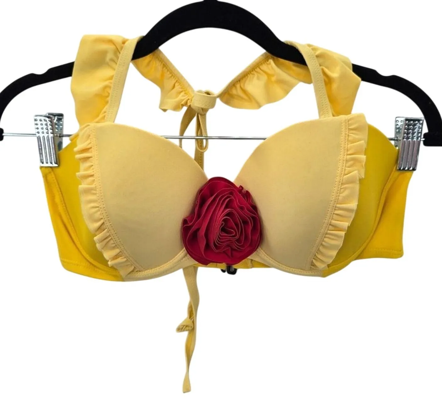 Disney Bell Rose Yellow Floral Ruffle Y2K 2000s Swim Bra Halter Costume S/M Yellow Red Floral Ruffle... Show more