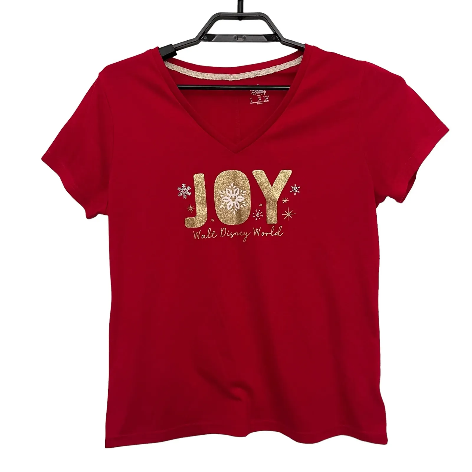Disney Parks Red JOY Tee Shirt XL V-Neck Gold Glitter Snowflakes Christmas Short sleeve, v-neck, Gol... Show more