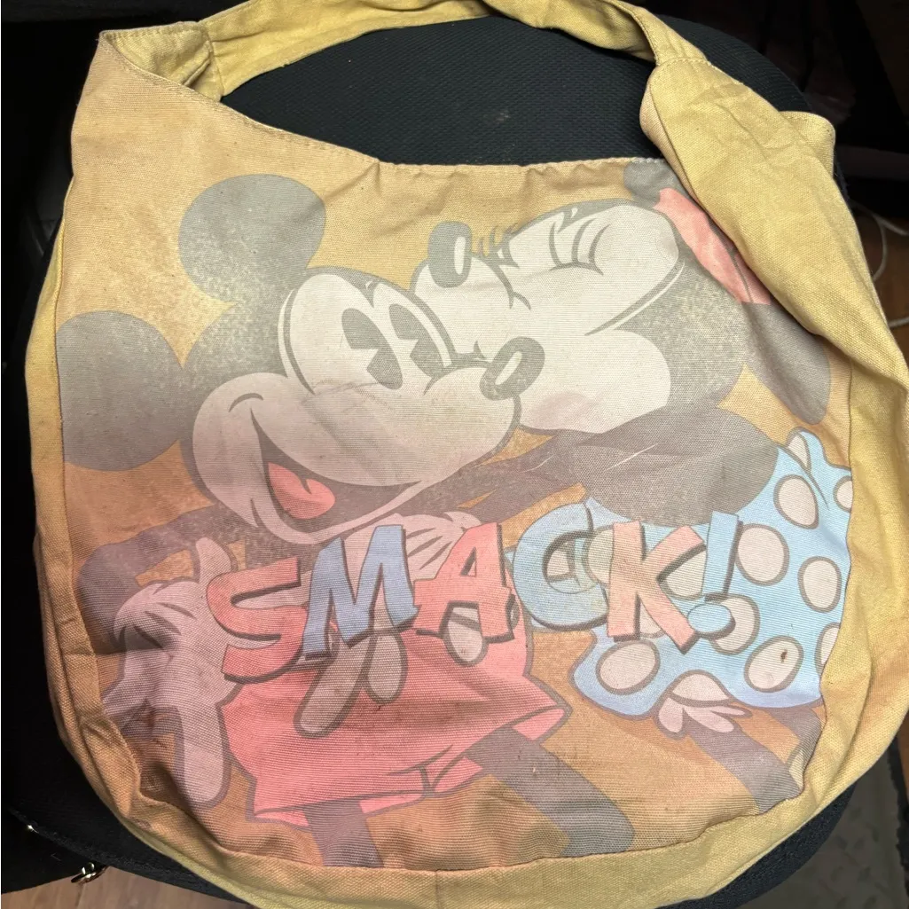 Cute and nostalgic Disney Mickey & Minnie tote bag featuring a retro “Smack!” kissing graphic. Tan c... Show more