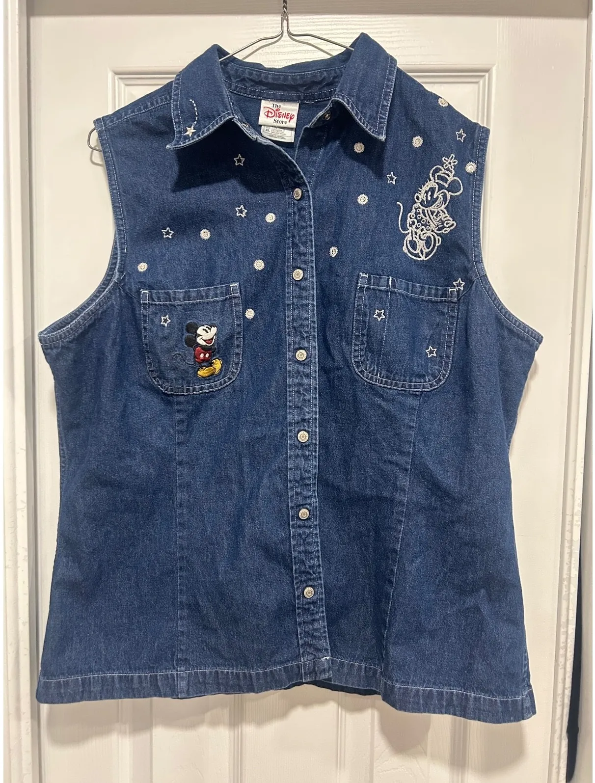 A charming Disney denim vest adorned with iconic Mickey Mouse embroidery and scattered stars. This s... Show more
