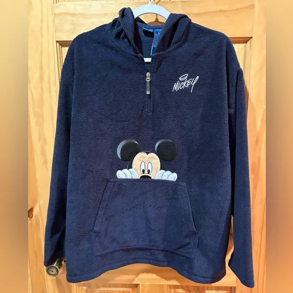 Disney fleece pullover featuring Mickey Mouse. It is a quarter-zip hoodie with a kangaroo pocket. "M... Show more