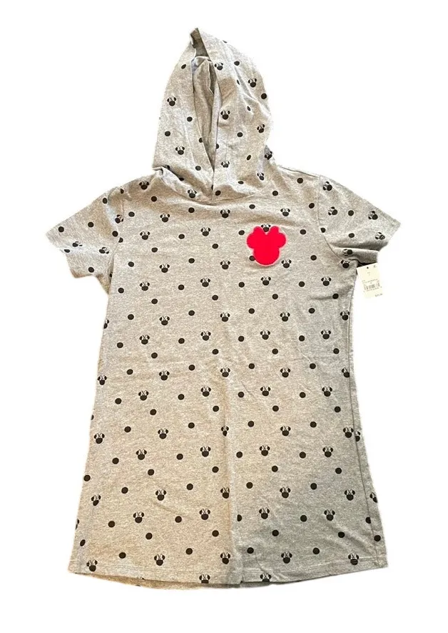 DISNEY Minnie Mouse Grey Sleep Gown Dress Hooded Polka Dot Red Embroidered Small Short sleeve Hooded... Show more