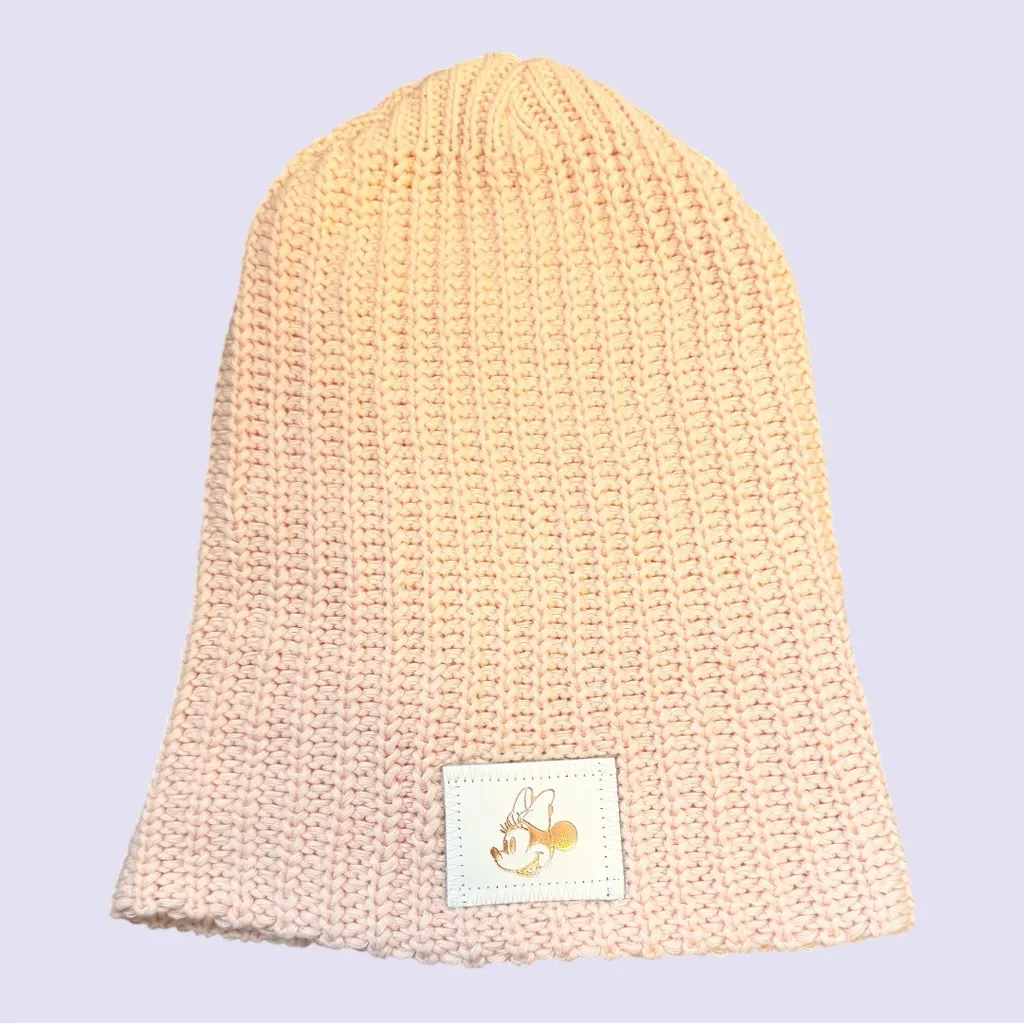 Keep cozy with this adorable pink knit beanie featuring Minnie Mouse in metallic Rose Gold. Perfect... Show more