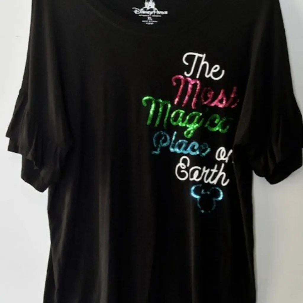 Disney Parks brings the magic to your wardrobe with this enchanting black T-shirt top, adorned with a whimsical array of sequins that capture the essence of your favorite classic characters – Mickey Mouse, Minnie Mouse, Donald Duck, and Alice in Wonderland. The lightweight fabric blend of 95% rayon and 5% spandex ensures a comfortable, stretch fit while the round neck and short sleeves offer a timeless silhouette. Carefully crafted for the Disney enthusiast, this XL top is a colorful nod to beloved cartoon themes. It features a playful ruffle accent that adds a touch of whimsy to the casual piece. Hand wash only care ensures the longevity and vibrancy of the unique design. This T-shirt is a versatile addition to any Disney fan's collection, seamlessly blending comfort and playful charm. 23 inches from arm pit to arm pit 13 inches from neck to end of sleeve 26 inches long