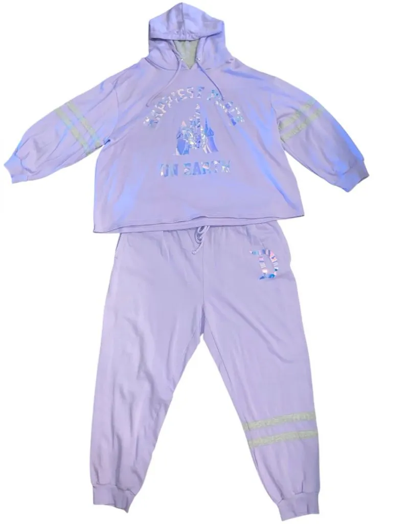 Lounge set b211326 sweatpants : 42inch waist 16”rise 59” hips Hoodie - 61” chest 26” shoulder to hem 17” underarm to sleeve hem the sweat pants tag says 1x however it’s measurements & fit are 3x the hoodie tag says 3x . Cozy and Colorful lavender perfect for any Disney fan .