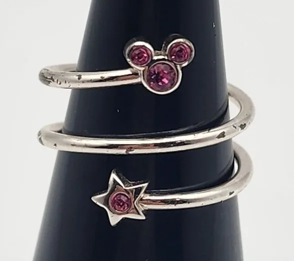 Disney silver tone wrap ring with a Mickey Mouse with pink rhinestones on one side and a star with a... Show more