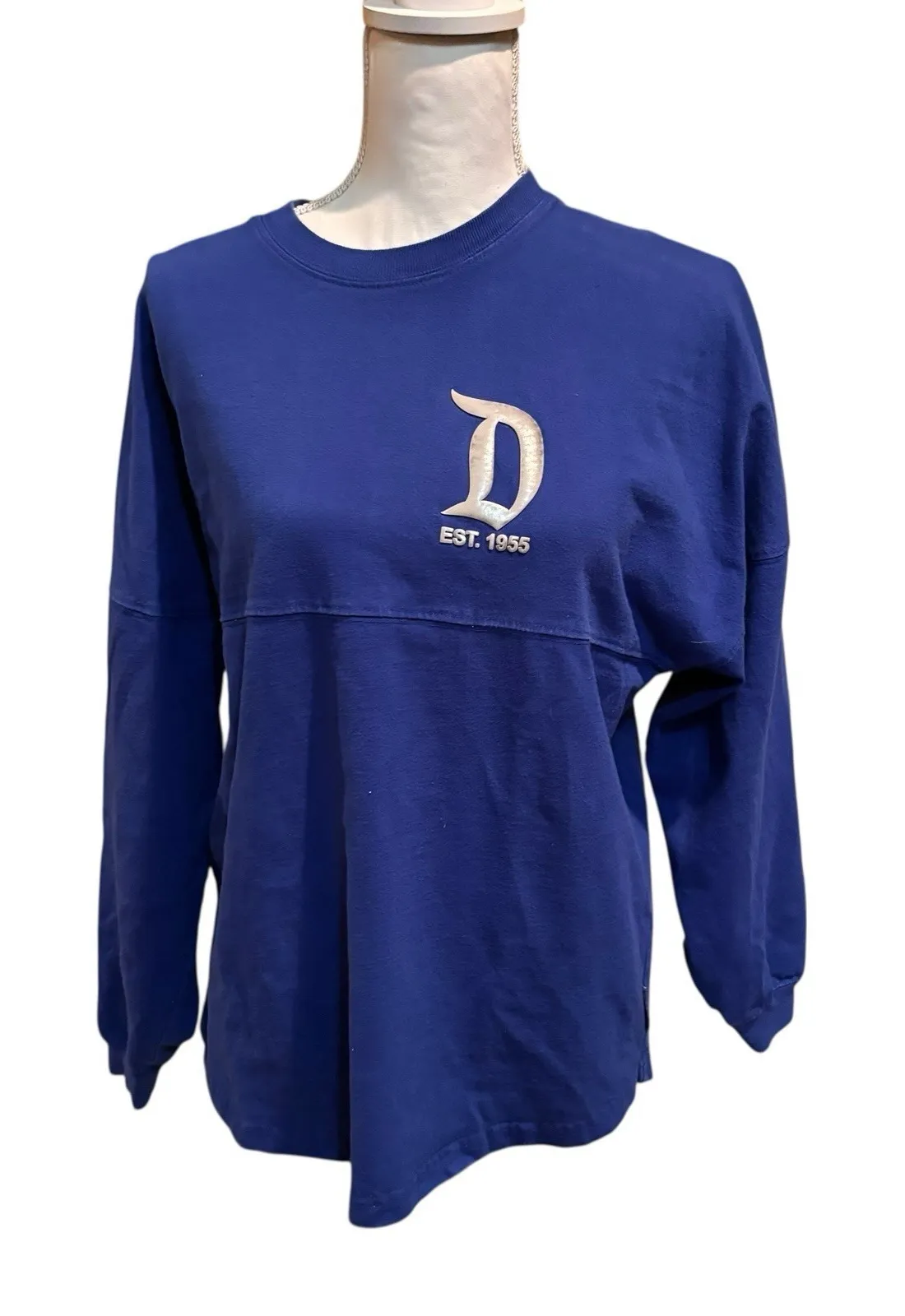 Authentic Disney Spirit Jersey® • Royal blue with silver raised puff-print graphics • Oversized fit with dropped shoulders • Long sleeves • Scoop hem • 100% cotton for comfort • Size: Women's Small (S) Armpit to armpit 22 inches Length 27 inches