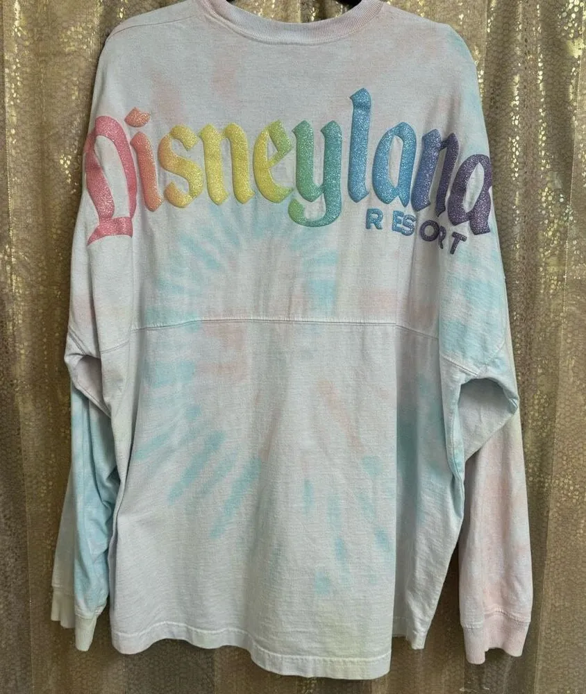Women's Disneyland Spirit Jersey Colorful Pastel Rainbow Tie Dye Glitter Long Sleeve Shirt XL USED... Show more