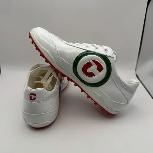 The Diva Del Cosmo Women KUBANANEO golf shoes are a stylish and practical choice for female golfers. These spikeless shoes are waterproof, making them perfect for playing in various weather conditions. The white color with green and red accents adds a touch of flair to the classic sneaker design. Made of leather with a comfortable leather insole, these shoes offer both durability and comfort on the golf course. The brand Duca del Cosma is known for quality and performance, making these shoes a reliable option for any avid golfer.
