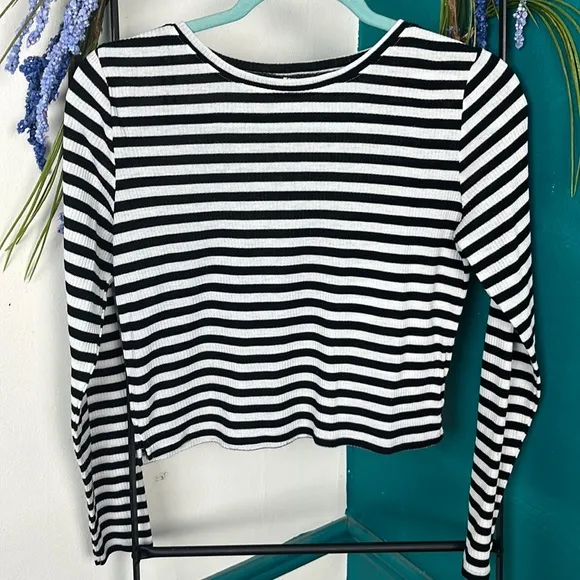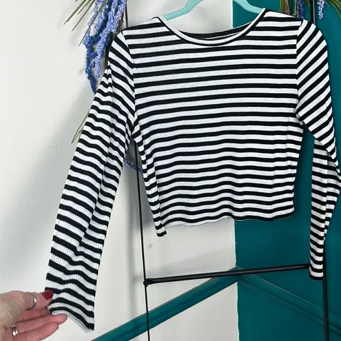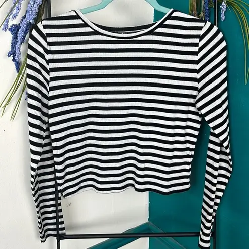 H&M divided black and white striped long sleeve ribbed crew neck cropped T-shirt