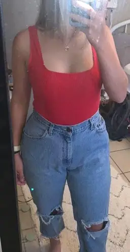 Bright red square neck line bodysuit. Ribbed textured. So freaking cute with blue jeans/shorts or sk... Show more