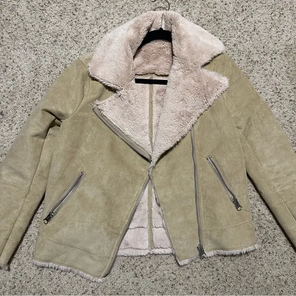 Super soft faux fur coat and faux suede in a cool moto jacket style with silver hardware. Size XS