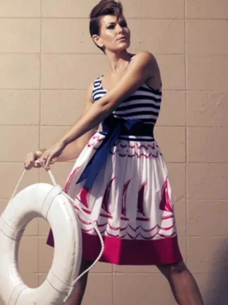 Embrace a nautical vibe with this stylish dress featuring classic navy stripes and vibrant red accen... Show more