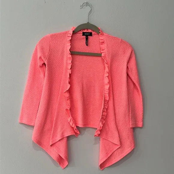 DKNY SHRUG SWEATER Features: Coral Open Front Cascade side Size Small Long Sleeve Sweater/Cardigan... Show more