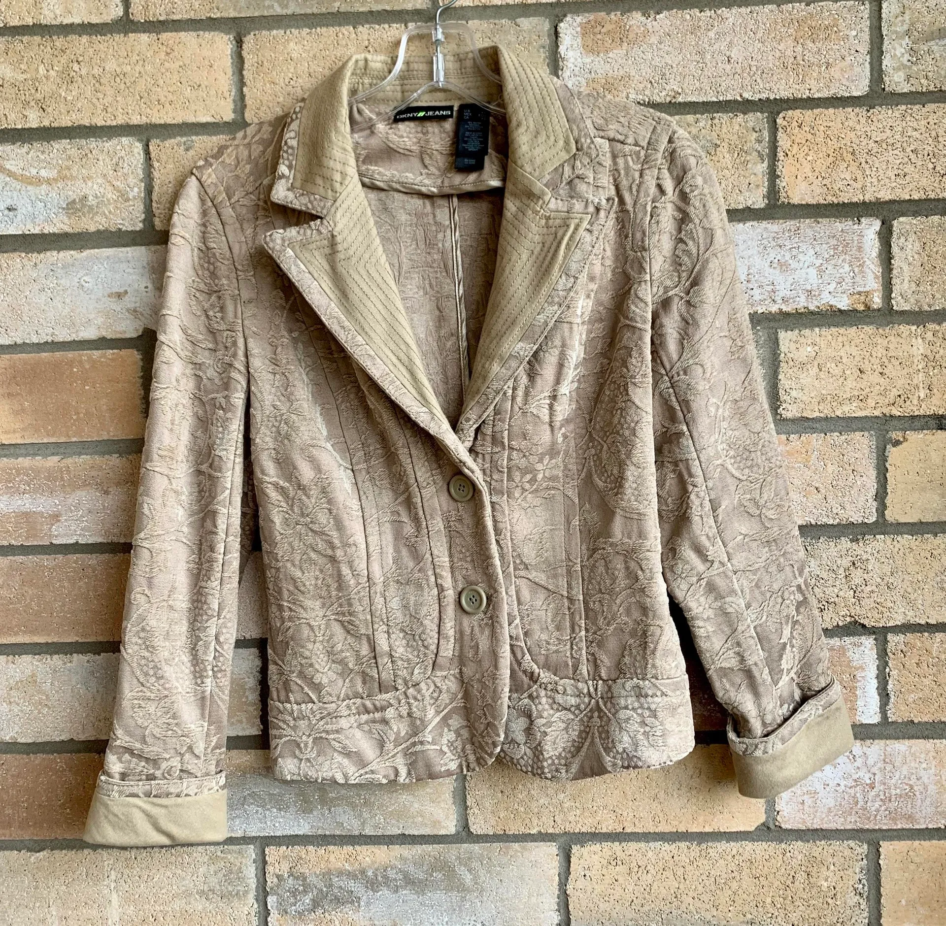 Vintage DKNY jacket. Tan floral. Slightly cropped. Velvet feel. Size x-small. Kept in excellent cond... Show more