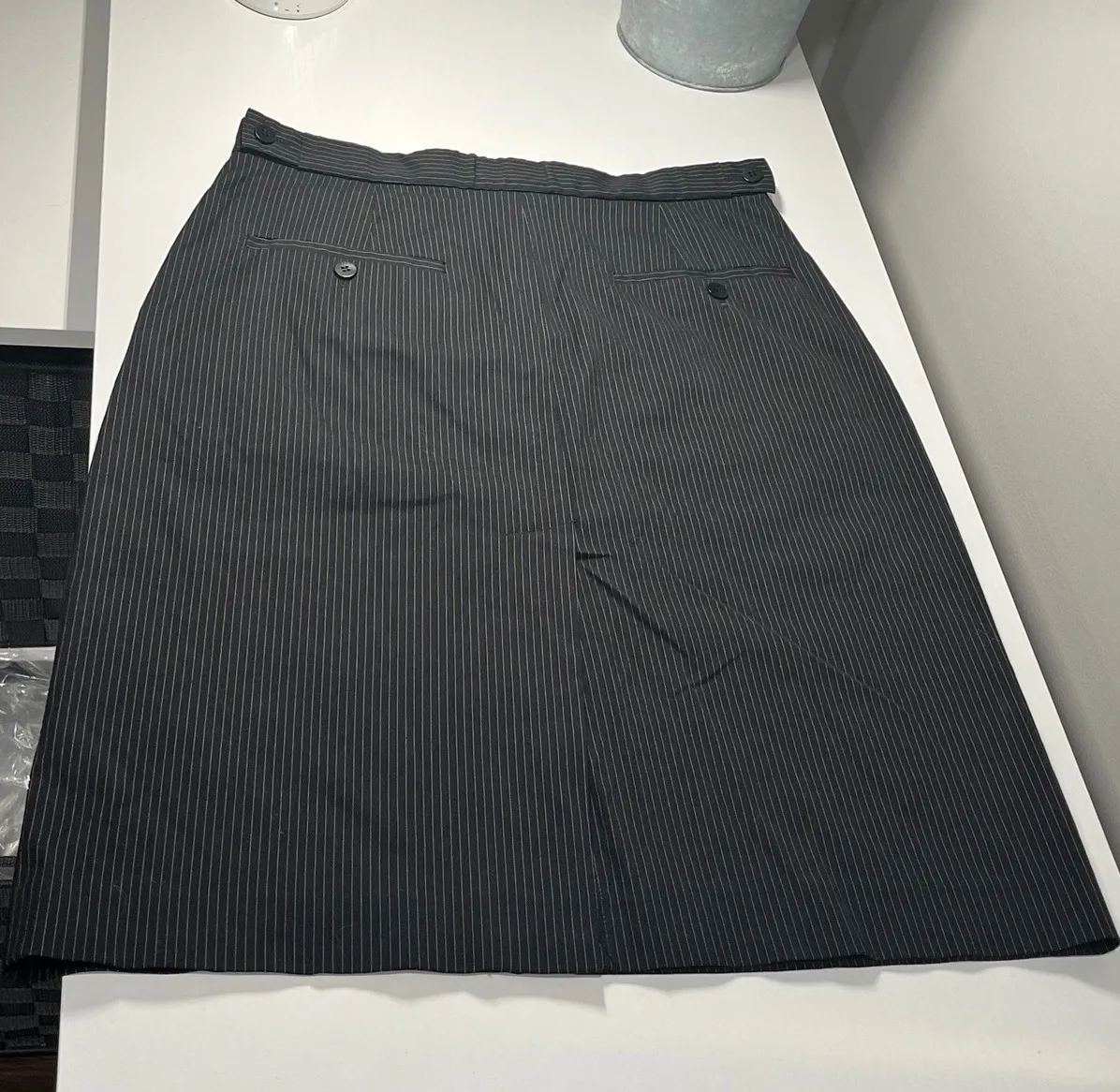 DKNY pinstripe pencil skirt in black with thin white vertical pinstripes. This classic professional silhouette features a clean, tailored finish with a flat front waistband. Side button adjustments and two buttoned welt pockets on the back add detail, while a center back slit ensures ease of movement. Fabric: High-quality blend of 54% Cotton, 37% Nylon, 5% Spandex, and 4% Other Fiber.