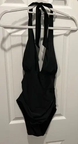 Elegant black one-piece swimsuit. Sleek design. Perfect for swimming or lounging. Worn once.