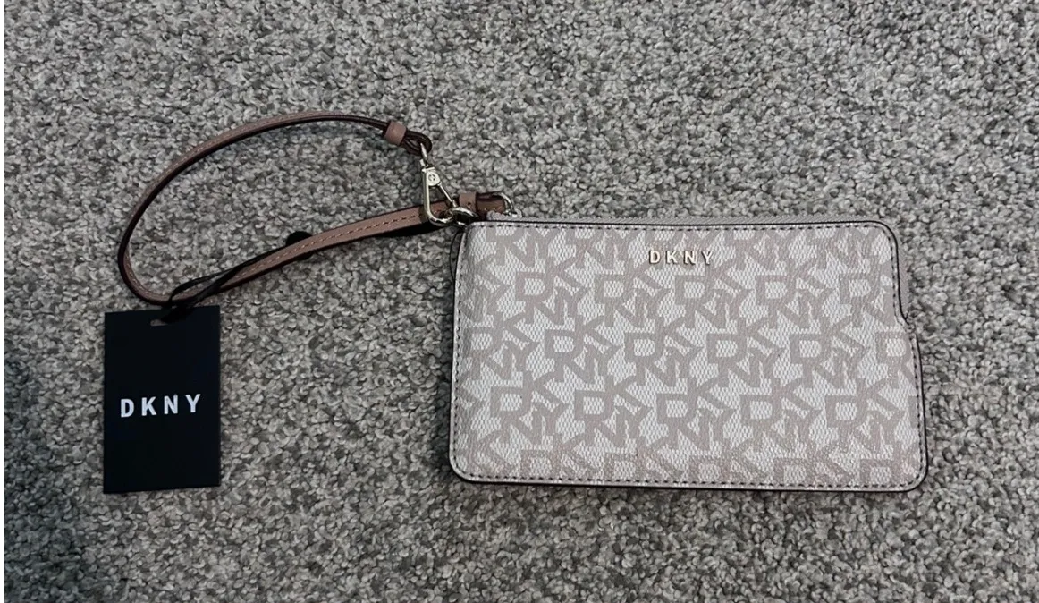 Envelop yourself in stylish simplicity with this DKNY wristlet pouch. Neutral beige tones showcase a... Show more