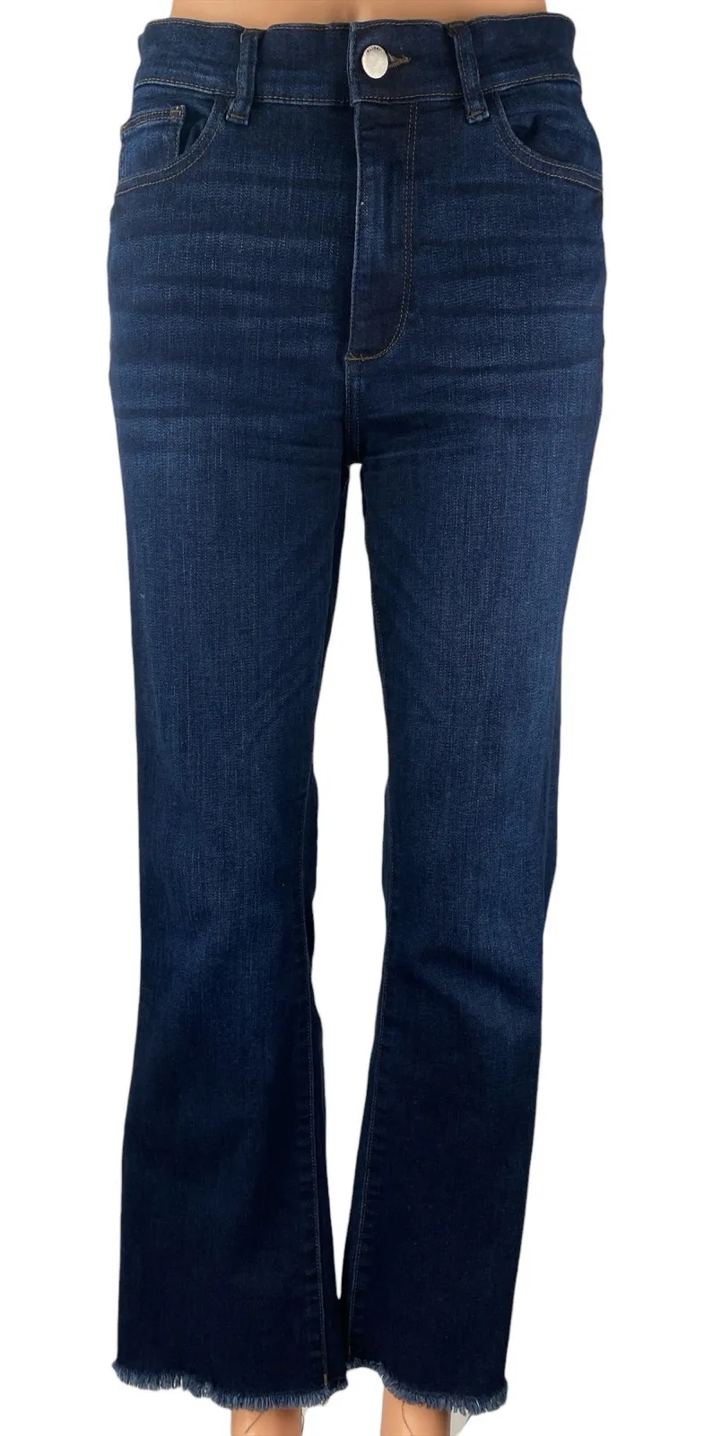 DL1961 Dark Blue Frayed Raw Hem Bootcut Denim High Rise Flare Jeans Pants Size 27 Size: 27 Condition: Very Good Rise: 10” Waist: 28” Inseam: 26” *Measurements are taken lying flat. We double the flat lay measurements of the waist. **The mannequin is a size small / plus size mannequin is a size extra large.