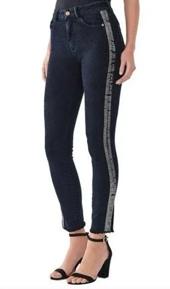The Farrow is an ankle length, high rise skinny jean with a figure flattering contouring waistband. Excellent preloved condition Tuxedo stripe in blacksilver down both sides Raw hem Two buttons at bottom of leg (as shown) Stretch material 93% Cotton, 6% Polyester, 1% Lycra Inseam approximately 28 inches Waist (laying flat)- 14 inches