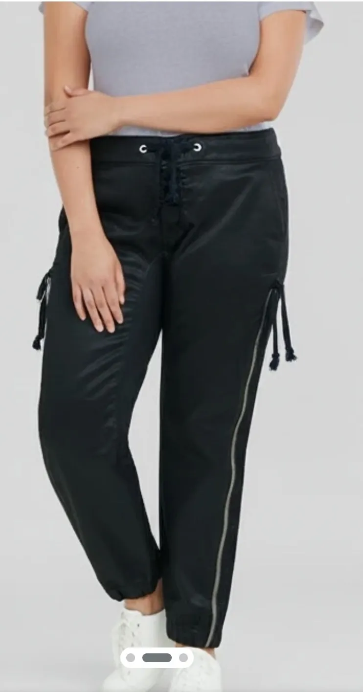 DL1961 Gwen Jogger pants in Pitch Black knit coated denim. These stylish joggers feature a drawstring waist for adjustable comfort and striking zippered detailing along the legs. The cuffed ankles add a modern silhouette. Perfect for casual outings, travel, or a relaxed day at home. Style: Jogger Department: Women Material: Cotton, Spandex Leg Style: Tapered Type: Pants Fabric Type: Knit Features: Adjustable Waist, Pockets, Cuffed, Ankle Zip Closure: Drawstring, Zip Pattern: Solid Accents: Zipper, Drawstring Occasion: Casual Waist Size: 27 in Fit: Slim Rise: Mid (8.5-10.5 in) Keywords: DL1961 pants, knit denim joggers, black joggers, zipper accent, drawstring pants, casual wear, athleisure, travel pants, street style, comfortable, modern fit, designer denim • Approximate measurements are in photos. • Smoke free/pet friendly home. • I ship out in 1-2 days. • Thank you for shopping my closet.