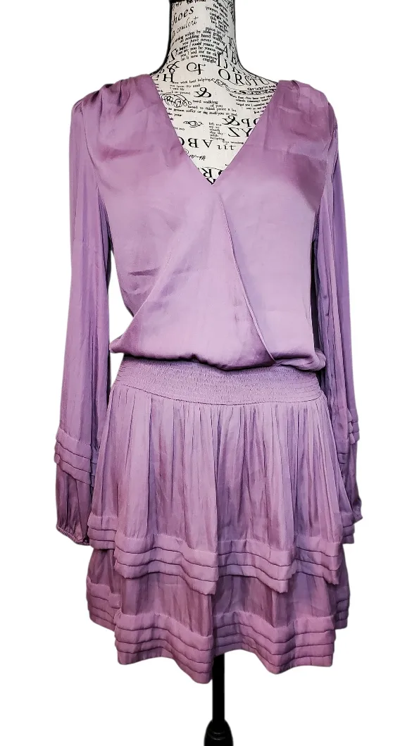 Beautiful DO+BE lilac mini dress featuring long puff sleeves, a smocked waist, and a tiered ruffle h... Show more