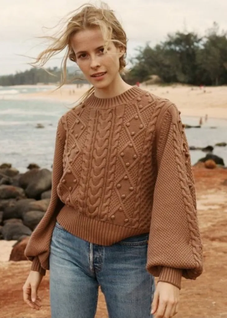 Doen Lulu sweater crafted from 100% organic cotton featuring a rich brown tone, textured pom pom detailing, and a cozy vintage-inspired silhouette. Brand: Doen Style: Lulu Sweater Color: Brown Size: Medium (Women’s) Material: 100% Organic Cotton Features: Pom pom textured knit, ribbed cuffs and hem, crewneck, cropped length Measurements (flat): Pit to pit 20 in, Length 22 in Condition: Pre-owned, great condition. No stains or holes. Light loose knit at cuff. See photos for details Style Tags: #Cottagecore #Organic #Minimalist #Knitwear #VintageInspired
