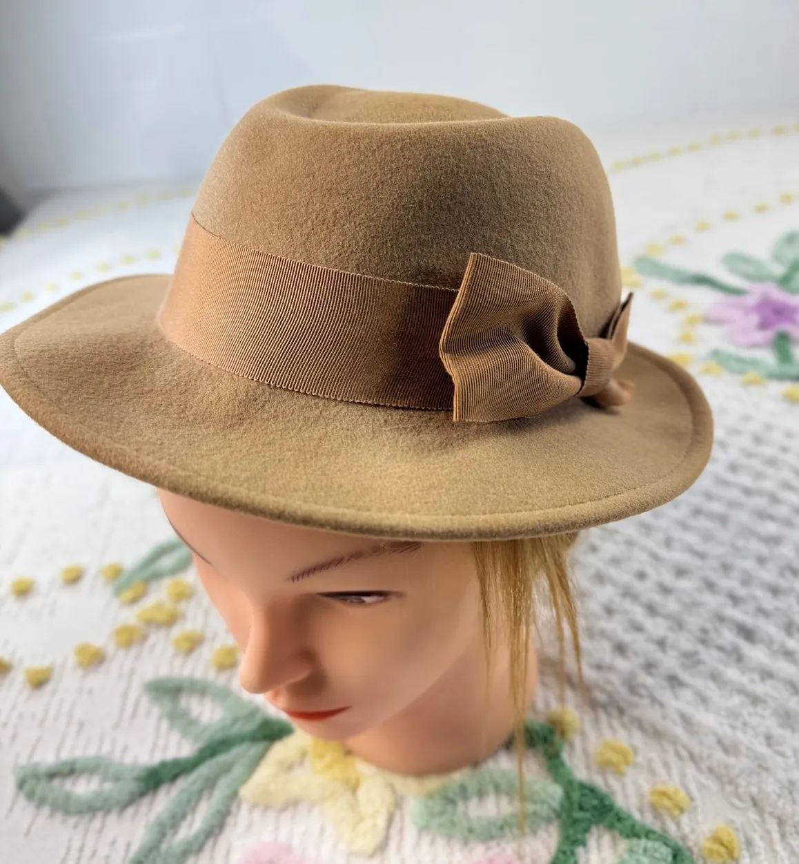 Elevate your look with this classic taupe Doeskin felt fedora. A sophisticated ribbon band with a charming bow accent adorns this timeless hat, exuding an air of vintage elegance. Crafted for enduring style, this piece adds a touch of refined grace to any ensemble. Perfect for a stylish day out, a sophisticated brunch, or a charming garden party. Style: Fedora Department: Unisex Adults Material: Wool Fabric Type: Felt Season: Fall, Spring, Winter Accents: Bow Features: Wide Brim Occasion: Casual, Business, Workwear, Party/Cocktail Pattern: Solid Country of Origin: United States Keywords: felt fedora, wool hat, bow detail, vintage style, classic hat, women's fashion, elegant, sophisticated, daywear, brunch, garden party, accessory, headwear