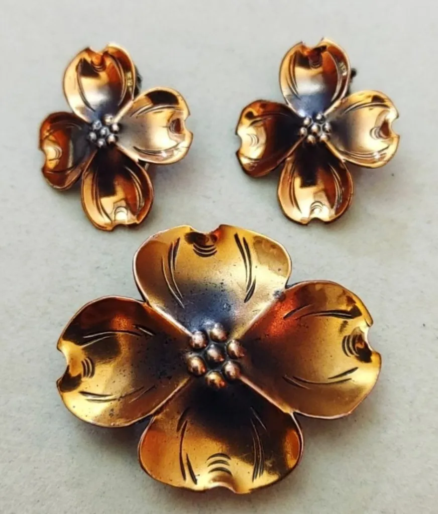This vintage jewelry set features an elegant copper floral motif, showcasing timeless craftsmanship.... Show more
