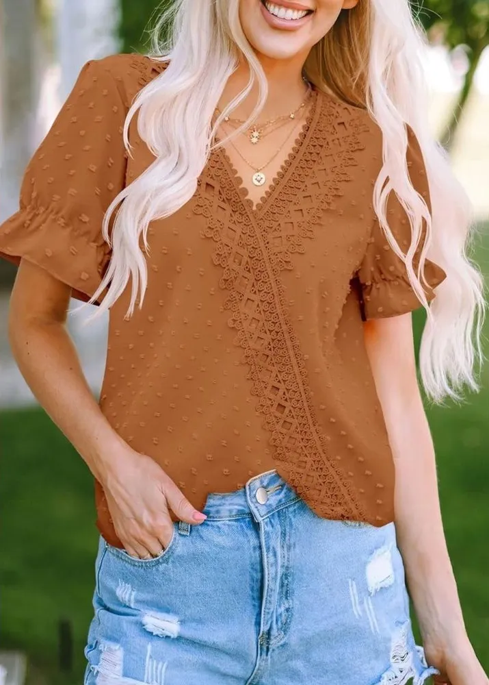 Color: Burnt Orange Size: 2x Fabric type 95% Polyester, 5% Spandex Care instructions Machine Wash About this item MATERIAL: The womens v neck short sleeve tops adopts high quality fabric, soft and breathable, will offer you first-class comfort, the comfy material with simple and solid color design makes this puff blouse for most lady's body shape FEATURES: Thanks to the pull on closure, this womens dressy casual tops shirts can be dressed up and down easily. The featuring shapes with classical v-neck, puff short sleeve, lace crochet around neckline MATCH: This eye-catching women summer short sleeve shirts tops can easily pair with any clothes and shoes in your wardrobe, like skinny jeans, leggings, skirts, boot, high heels or sport shoes, for a elegant & casual look in summer OCCASION: This lightweight v neck blouses for women are not only elegant pullover tops but also casual summer tops, perfectly suited for shopping, party, work, office, night out, date, vacation,casual, leisure,formal and daily wear, etc