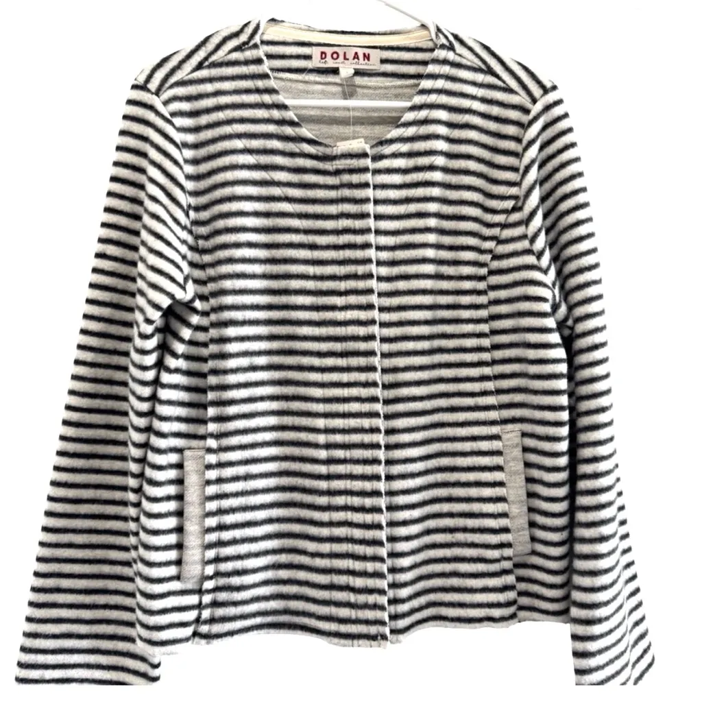 Anthropologie Dolan Striped Full Zip Jacket This is a black and white striped full-zip jacket from the Dolan Left Coast collection for Anthropologie. It is as a soft, cozy, and preppy coastal style jacket. The material polyester and cotton, “brushed fleece" or a "soft fleece style". It features a round neckline and a full zip closure. having a moto style with raw edges and slash pockets.