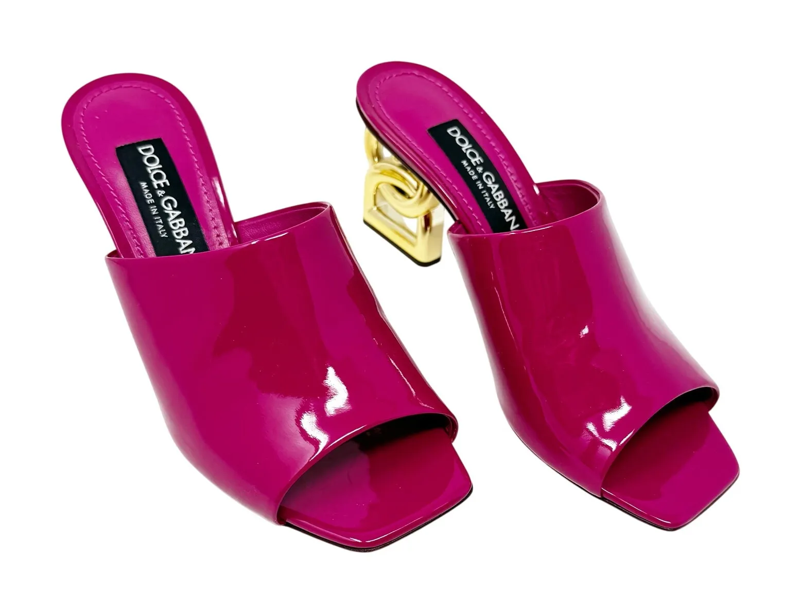 Turn heads in these bold Dolce & Gabbana fuchsia patent leather mules featuring a sculptural gold DG... Show more