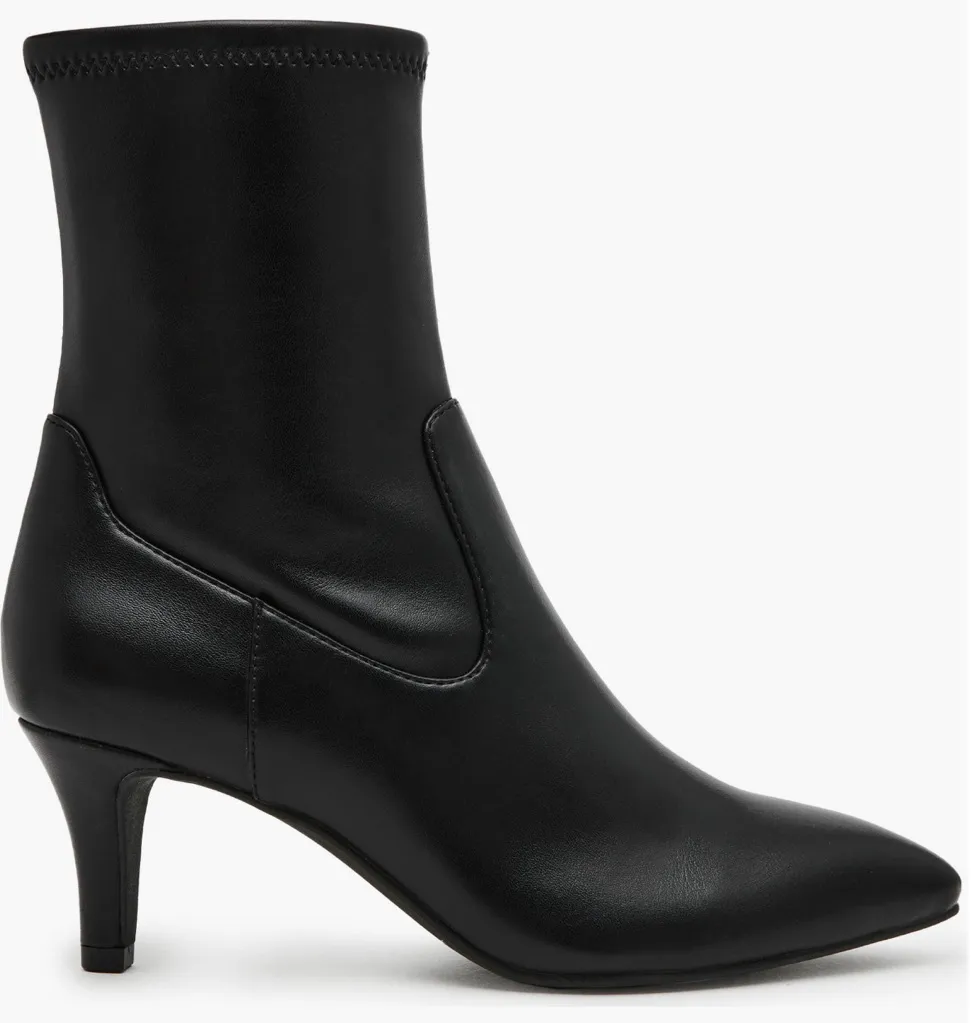 A smooth pointy toe and slender kitten heel define an ankle-high boot with a flexible, stretch shaft... Show more