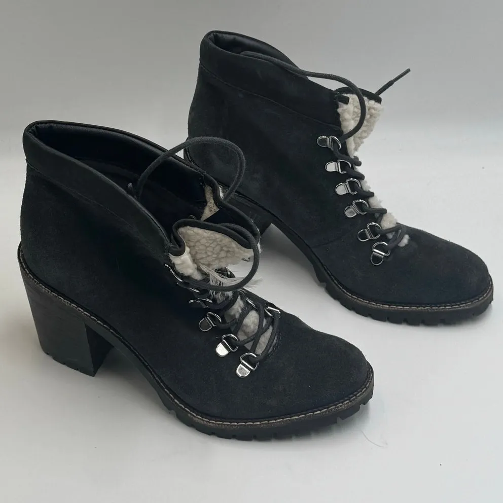 Elevate your winter style with these Dolce Vita ankle boots, crafted from genuine black suede with plush faux sherpa trim at the tongue and collar for both warmth and a rugged-chic look. The lace-up design with metal D-rings channels timeless hiker-boot inspiration, while the chunky 3" block heel and lug sole add modern edge. Cozy yet versatile, they pair perfectly with skinny jeans and a sweater for a casual weekend vibe or with a dress and tights for a trend-forward outfit. Condition: Gently used, excellent with minimal signs of wear. See photos for details. Content Suede upper · Faux sherpa lining · Textile/synthetic lining · Synthetic sole Heel Height: 3" block heel Size: Women’s 8.5 black suede · faux sherpa trim · lace-up · ankle booties · block heel · lug sole · hiker style · cozy chic · modern · winter · fall · trendy · edgy