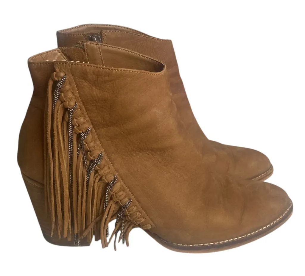 In Good Condition Light overall wear Suede Booties Fringe and Chain Details Block Heel Neutral tan Brown Zipper Closure Tags: boho, hippie, western, fringe, fall, suede, neutral