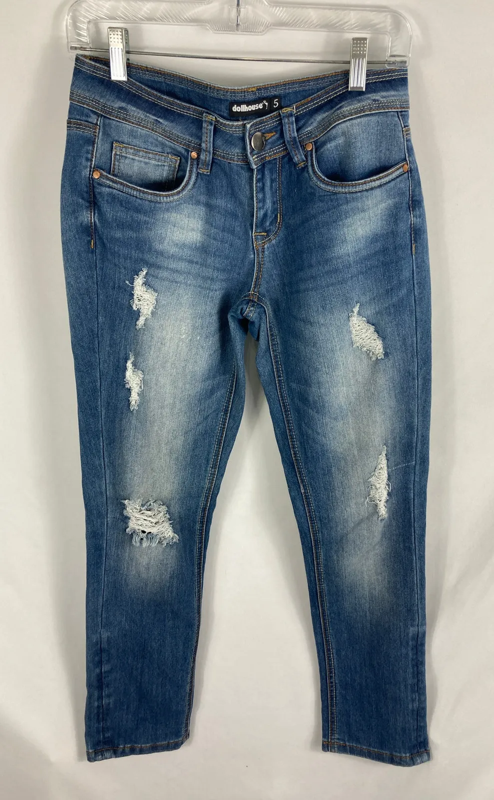 You are viewing a pair of Dollhouse brand jeans. These are the Charley Distressed Skinny Jeans in a size 5. These jeans feature a skinny fit and distressed detailing for a trendy, edgy look. Perfect for adding some style to your wardrobe! They are gently used. No rips or stains. Make these yours today!