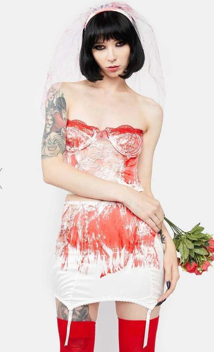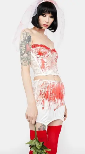 Worn once! Fits true to size :) comes with corset top, skirt, veil and roses !!