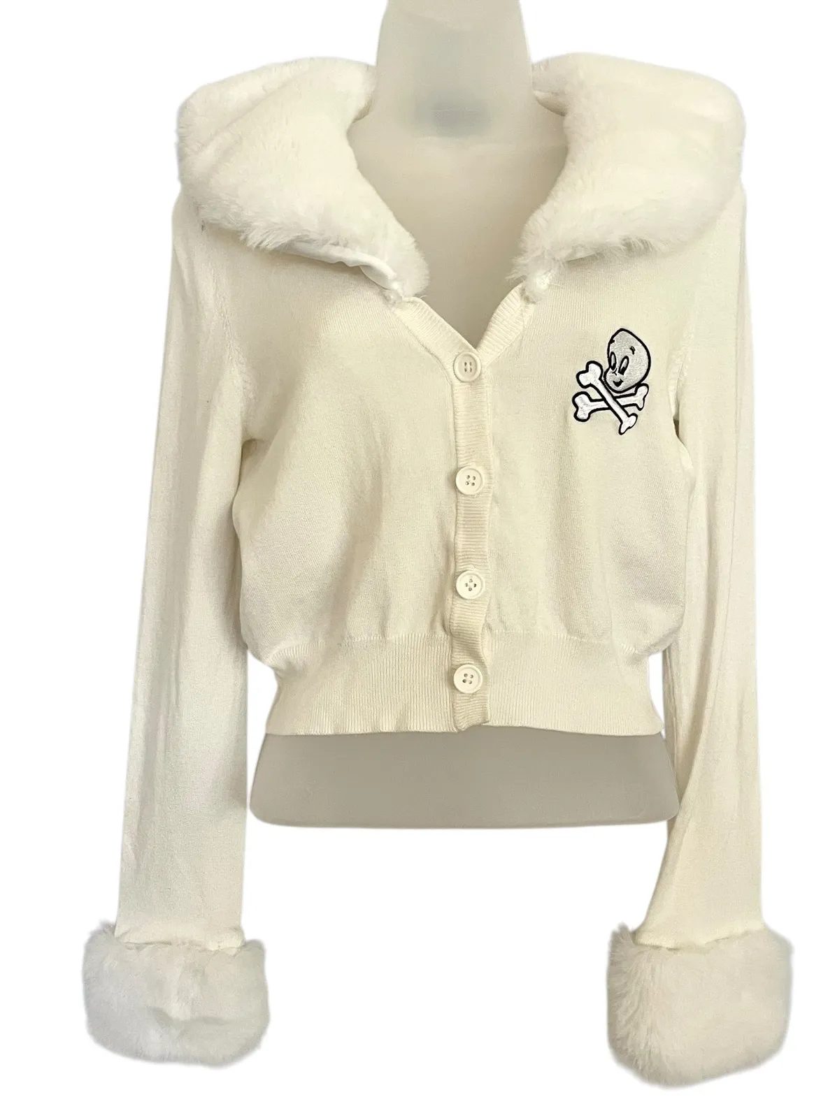 You're too cute to spook. This long sleeve cardigan has a faux fur collar and cuffs, Casper the Frie... Show more