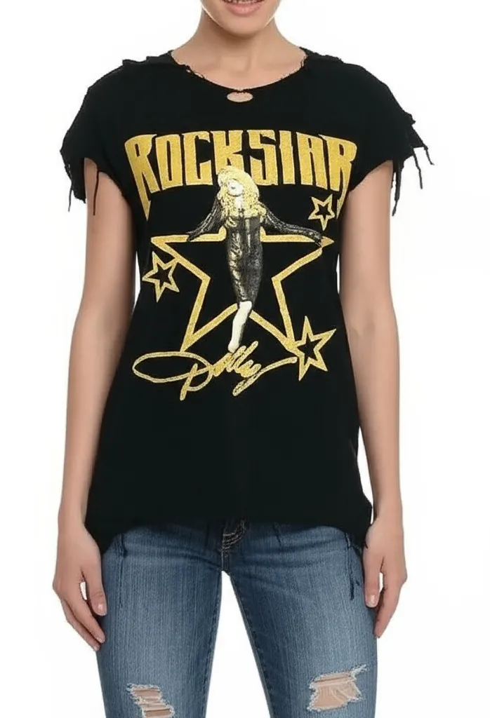 Dolly Parton T-Shirt Womens Size Small Black Gold Rockstar Graphic Country Music Tee Condition: Fair condition. Distressed/cut collar. Size: Small Material: 100% Cotton Features: Dolly Parton Rockstar graphic, gold star outline, stylized Dolly signature, distressed neckline Measurements: See pictures. Tags: concert, casual, fanwear, vintage, southern, nashville, western, bandmerch, musiclover, iconic, bold, divastyle