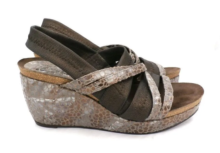 Donald J Pliner Copper Metallic BRWNLeather Wedge Sandals 8N Becky Animal Print Donald J Pliner wedge sandals/ shoes were worn once! COLOR: Bronze metallic & Brown They have elastic and leather straps Heel height: 3 1/4" w/ front 1 1/4" platform leather/fabric upper/leather lining/leather sole $240 retail Made on the beaches of Spain!