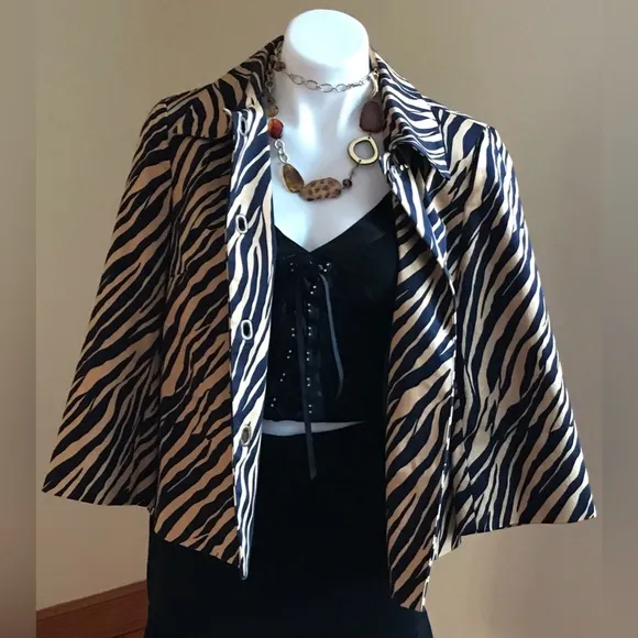 Doncaster Black And Tan Animal Print 4 Gold Metal Buckle Buttons Wide Sleeves Size 8 Great Condition measurements length is 22 inches. Sleeves are 18 inches Armpit to armpit is 18 inches