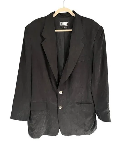 T1 1990s Vintage Command attention with this sophisticated DKNY blazer, a timeless piece that exudes effortless elegance. The classic black hue offers versatility, making it a staple for any wardrobe. The tailored silhouette ensures a flattering fit, while the smooth lining provides all-day comfort. This blazer features a notched lapel, two-button closure, and functional pockets, blending practicality with refined style. Perfect for sealing deals in the boardroom, adding polish to a business casual ensemble, or elevating your evening attire for a night out. Keywords: DKNY blazer, silk blazer, black blazer, career jacket, business casual, size 14 blazer, womens blazer, classic blazer, office wear, professional attire, interview outfit, formal blazer, silk jacket