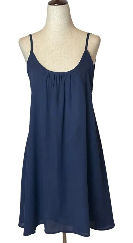 This dress by Donna Mizani is in great condition. It has a small stain on the back that isn't noticeable but looks a little darker as pictured. It features an a-line silhouette made possible by a back strap that pulls the two sides of the dress in for a more fitted look. It is sleeveless with a low scoop neck that falls in pleats. It has a low open back and is mini in length. It is lined. All offers are welcomed! ❤ Professional seller, smoke-free home, and same or next day shipping. Like items for price drops. Receive the 20% off bundle discount when you purchase two or more items. Condition: Excellent Color: Navy Blue Material: Polyester Size: Small Measurements: armpit to armpit 16.5 in, length 31 in crepe, date night, a-line, night out, party, mini, wedding, classic, designer, holiday, NYE, New Year's Eve, reception, cocktail, rehearsal