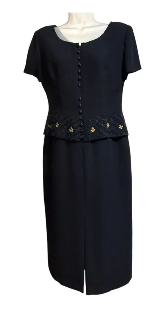 Donna Morgan Petites black sheath dress with short sleeves and a beaded waist accent. The dress features a round neckline with a subtle scalloped edge and a button-down front. A beaded band cinches the waist, adorned with delicate floral embroidery in shades of pink and yellow. The skirt is a classic sheath silhouette with a vent at the front hem. Keywords: Donna Morgan Petites, sheath dress, beaded dress, embroidered dress, petite dress, knee length dress, short sleeve dress, formal dress, cocktail dress, career dress, classic dress