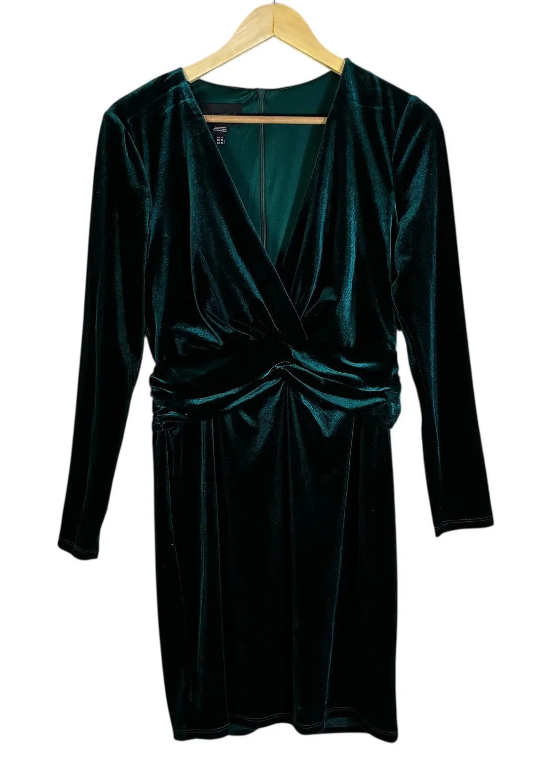Ruched front accents Pull-on wrap style V-neckline Velvet fabric Stretch Fitted silhouette 92% Polyester 8% Spandex Lined Long sleeve Solid green pattern Knee-length dress Soft luxe hand feel Cocktail Going Out Glam Sophisticated Event Approx. Measurements: Pit to pit: 16.5" Sleeve: 23" Length: 34"
