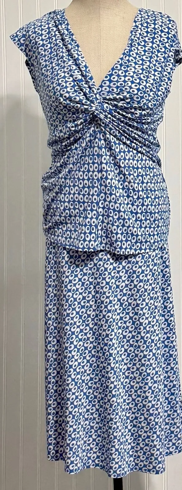 • Excellent pre-owned condition. The stretch jersey fabric maintains its shape and the colors are vibrant with no wash wear. • See photos for tags and details. Reach out with any questions. • Brand: Donna Morgan • Size: 12 • Era: Y2K (circa 2000s) • Features: Two-piece set with a twist-front V-neck top and a matching A-line skirt. Iconic blue and white geometric circle pattern. Y2K, 2000s, Mod, Retro, Geometric Print, Indie Sleaze, Office Siren, Two Piece Set, Co-ords, Blue Indigo, Travel Friendly, Stretchy, Mid Century Modern Style